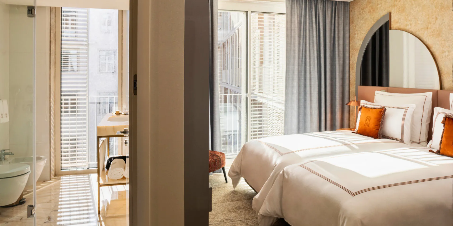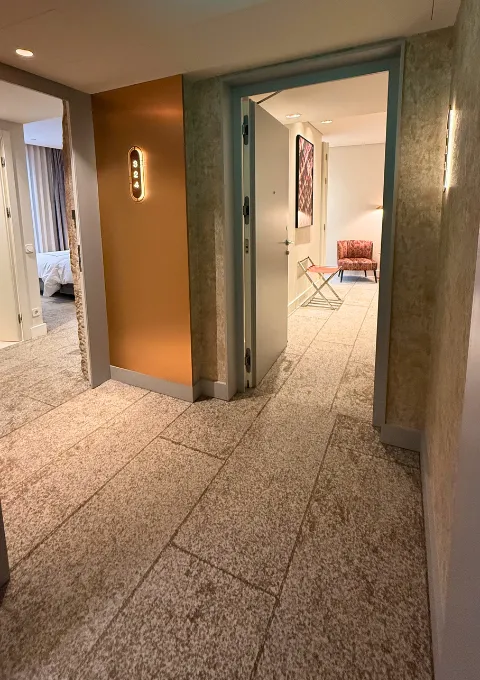 Discover our Family Room with 58 sqm connected space combining two rooms, one with a king bed and another with twin beds, offering the ideal balance between family time and privacy. Enjoy soothing décor with art by Portuguese artist Jorge Possolo, a Nespresso machine, and minibar for added comfort. Featuring two marble bathrooms, one with a walk-in shower and the other with both shower and bathtub, complemented by Karl Lagerfeld amenities.