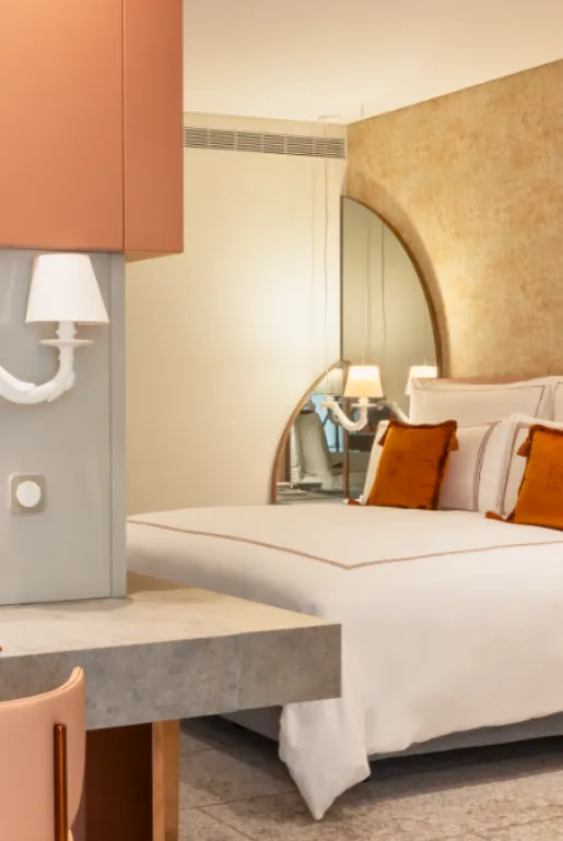 The luminous pink marble bathrooms feature a large walk-in shower ( some have also bathtubs), an assortment of premium Karl Lagerfeld beauty amenities and luxurious essentials such as a plush 420-thread cotton bathrobe, slippers, recycled and bio-degradable amenities, an enlarging mirror and a hair-dryer.